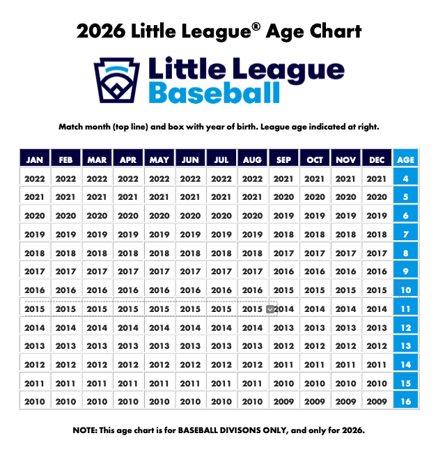 All ages referenced below are based on what the league age will be for 2026 - please refer to the chart above.